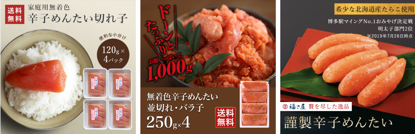 【PR】福さ屋 詳細はこちらをクリック 本場博多の無着色で上質辛子明太子のご紹介です。こちらの辛子明太子は、テレビ番組に取り上げられるほど人気です!おいしさの理由は、①特製たれ②ひと腹ひと腹、丹念に吟味したタラコのみ使用③三昼夜、時間をかけて熟成③化学調味料を減らすことで、濃厚な味わいを維持④どなたでも食べられるよう「程よい辛さ」⑤無着色子供から大人まで、老若男女問わず幅広い世代に愛される味。ご自宅用はもちろん、ご近所の方におすそ分け、普段お世話になっている人に贈るお中元やお歳暮に♪また、結婚祝いのお返しに、ご飯のお供にもお酒の肴にもなる辛子めんたいは、家族への贈り物にもピッタリです。さらに「福岡」という地域性も出せる辛子明太子は出張、旅行のお土産にも最適です。引越し祝いにもオススメ。引越し前後はどうしてもバタバタしてしまうので、こちらの明太子で簡単においしくご飯を済ませることが出来、喜んでいただけるはず!ぜひ一度、この辛子明太子を味わってみてください! おすすめ商品 ご自宅用 詳細は画像をクリック 家庭用無着色 辛子めんたい切れ子120g×4 税込 3,800円内容量120g×4パック「切れ子」とは、明太子の端が切れたり、形が崩れてしまったもの。見た目の問題だけで、品質や味に変わりはありません。冷凍便でお届け。賞味期限は冷凍で60日。ご家族みんなでたっぷり味わえる大満足のボリューム。内容量もご贈答用に比べて大変お得となっています。 北海道産辛子めんたいお試しセット 税込 4,968円内容量めんたい並切れ:600g(300g×2個)※明太子は、切れ子、くずれいかめんたい:90gめんたい辛子たかな:130g賞味期限めんたい並切れ:冷蔵14日いかめんたい:製造日より冷蔵14日めんたい辛子たかな:製造日より常温180日 おすすめ商品 贈り物用 謹製辛子めんたい210g 北海道産原卵使用 税込 3,240 円内容量210g賞味期限 冷蔵14日贈り物におすすめです。見た目も綺麗なもののみ厳選。透き通った張りのある薄皮から見えてくる、際立つ粒々感。口の中でふわっと溶けるようななめらかな口当たりと、深い味わい。ご贈答用めんたい最高峰として、皆様に喜ばれること間違いなし! 「博多」礼文島産利尻昆布使用 プレミアムめんたい 税込 6,480円内容量 250g賞味期限 冷蔵14日贈り物におすすめです。厳選された国産原料にこだわり、北海道産原卵・国産唐辛子・国産本みりん、そして礼文島産の利尻昆布を贅沢に使用した自信作だそう!感謝の気持ちを込めた贈り物に、日頃お世話になっている方へのご挨拶にいかがでしょうか。 味楽セット 辛子明太子 いか 数の子 税込 5,400円内容量 辛子めんたいこ:270g数の子めんたい:90gいかめんたい:90g賞味期限 冷蔵14日贈り物におすすめです。いかめんたいは、いかのつるつるコリコリの食感とめんたいの深い味わいが、数の子めんたいは、数の子のポリポリ、プチプチの食感とめんたいの深い味わいがクセになる! ◆注意点◆お買い物袋は別途ご購入が必要です!送料についてお届け先1件につき 9,000円(税込)以上で送料無料。※冷蔵・冷凍:お届け先1件につき、全国一律 990円(税込)。 詳細は下記クリック↓↓↓ 商材名 福さ屋運営者 S※当サイトはアフィリエイトプログラムを利用し宣伝目的で作成しております。